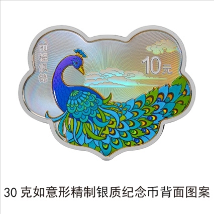 30克如意形銀質(zhì)“前程似錦”紀念幣背面圖案為孔雀、祥云裝飾組合圖案,并刊“前程似錦”字樣及面額。