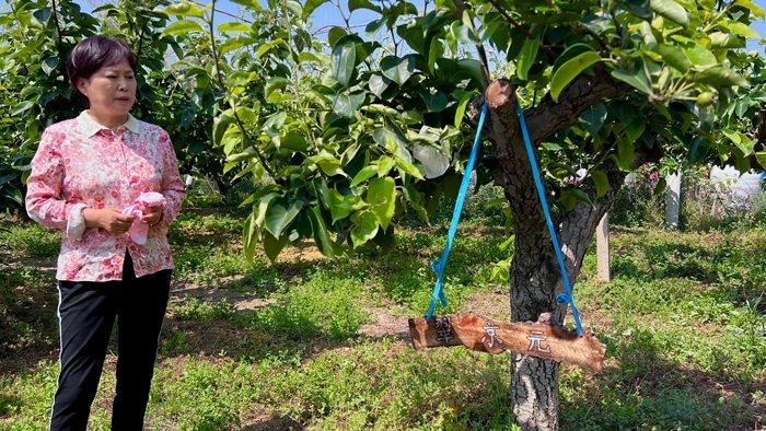 附近村民在梨園里實(shí)現(xiàn)就業(yè)。初夏時(shí)節(jié),村民給剛長出的小梨“穿衣裳”。