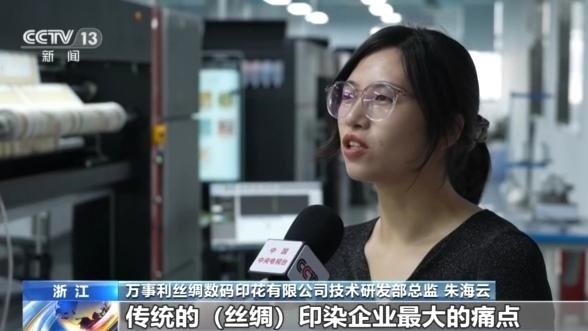 萬事利絲綢數(shù)碼印花有限公司技術(shù)研發(fā)部總監(jiān) 朱海云:傳統(tǒng)的絲綢印染企業(yè)最大的痛點就是庫存壓力,現(xiàn)在我們通過人工智能AI的設(shè)計,再加上我們的一體機快返的工藝特點,它能夠達(dá)到一個先銷后產(chǎn)的經(jīng)營模式,能夠解決我們庫存壓力的痛點。