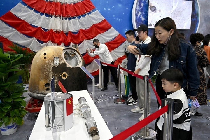 觀眾在安徽合肥舉辦的以“走向世界的中國航天”為主題的展覽上參觀嫦娥五號返回器等實(shí)物展品(2023年4月24日攝)。新華社記者 黃博涵 攝