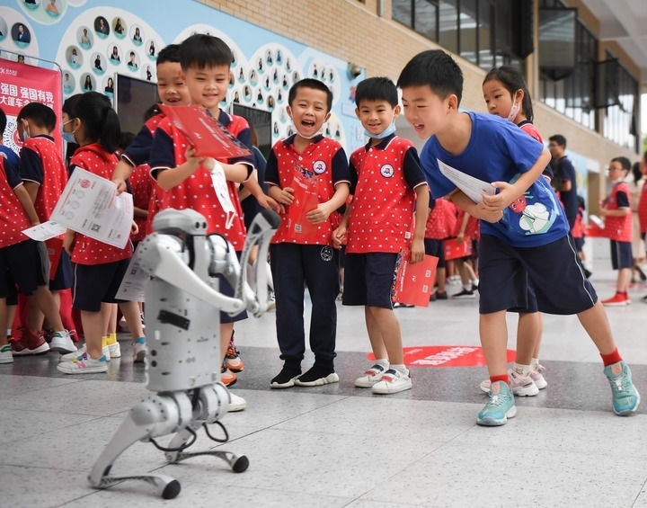 在湖南長沙華夏實(shí)驗(yàn)學(xué)校舉辦“科技大篷車”進(jìn)校園活動上,學(xué)生們在和機(jī)器狗互動(2022年6月22日攝)。新華社記者 薛宇舸 攝