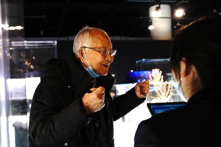 中國科學(xué)院院士汪品先在上海自然博物館舉行的“深海園林”展上介紹深海知識(2022年12月3日攝)。新華社記者 張建松 攝