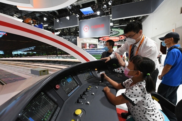 小朋友在2022年中國國際服務(wù)貿(mào)易交易會國家會議中心展館體驗(yàn)京張高鐵動車組模擬駕駛臺(2022年9月3日攝)。新華社記者 任超 攝
