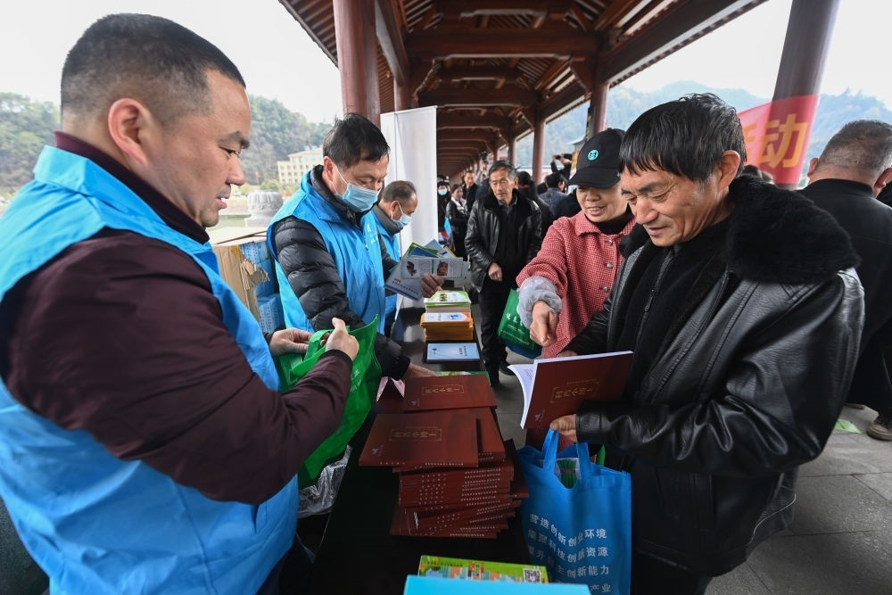 在杭州市臨安區(qū)昌化鎮(zhèn)舉行的春季文化科技衛(wèi)生“三下鄉(xiāng)”服務(wù)活動上,臨安區(qū)科學(xué)技術(shù)協(xié)會“三服務(wù)”小分隊(duì)的黨員志愿者將科普書籍贈送給當(dāng)?shù)厝罕姡?023年2月22日攝)。新華社記者 徐昱 攝