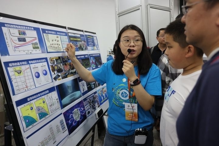 在中科院物理研究所超導(dǎo)國家重點(diǎn)實(shí)驗(yàn)室,志愿者在向參觀者普及超導(dǎo)知識(2023年5月13日攝)。新華社記者 金立旺 攝