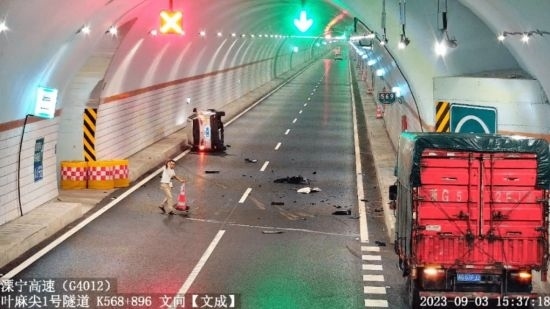 9月3日下午,在G4012溧寧高速葉麻尖隧道內(nèi),一輛小車碰撞隧道右側(cè)檢修帶,發(fā)生側(cè)翻,零部件散落一地。車內(nèi)3人被困,無法脫身,情況十分危險。1分鐘后,一輛牌照為浙G52FJ2的貨車經(jīng)過,司機李平江師傅見狀,立即把車停在緊急停車帶內(nèi),迅速下車并拿起隧道一側(cè)的隔離錐放在事故車后,用手勢示意后方來車減速慢行,防止二次事故發(fā)生。