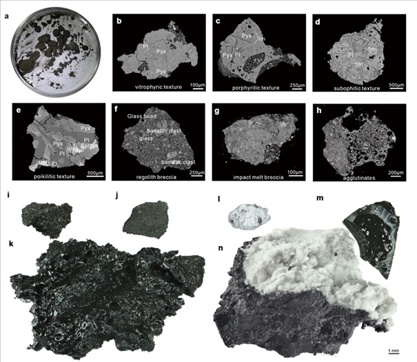 研究發(fā)現(xiàn),嫦娥六號采集的巖屑碎片主要由玄武巖、角礫巖、粘結(jié)巖、淺色巖石和玻璃質(zhì)物質(zhì)組成。其中,玄武巖碎片占總量的30%至40%,角礫巖和粘結(jié)巖由玄武巖碎屑、玻璃珠、玻璃碎片以及少量的斜長巖和蘇長巖等淺色巖石碎屑物質(zhì)構(gòu)成,進一步揭示了樣品來源的復雜性。