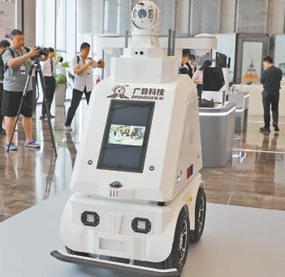 在2024蘇州國際科創(chuàng)大會場外,廣目科技展出的新款無人安防巡邏車。