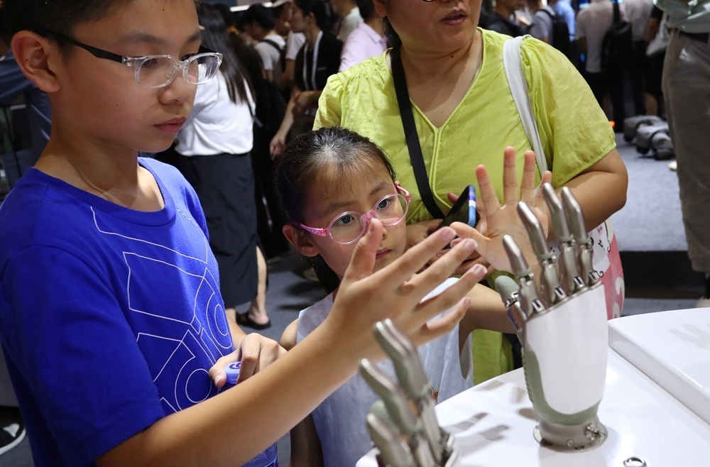 7月5日,在2024世界人工智能大會,小朋友在傲意科技機器人靈巧手展品旁參觀。新華社記者 方喆 攝