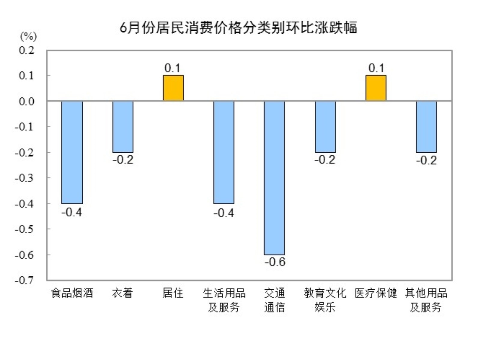 6月份,全國居民消費價格環(huán)比下降0.2%。其中,城市下降0.2%,農(nóng)村下降0.2%;食品價格下降0.6%,非食品價格下降0.2%;消費品價格下降0.4%,服務價格持平。