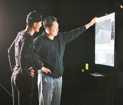 4月30日,在天津市濱海新區(qū)國家動漫園里的大型動作捕捉棚內(nèi),身著特定裝備的動捕演員(左)和同事在查看電腦生成的虛擬角色動作。新華社記者 趙子碩攝
