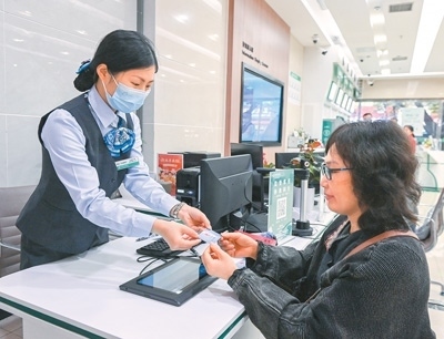 “社保服務(wù)事項進(jìn)銀行”是重慶市社會保險局創(chuàng)新推出的一項公益服務(wù),合作銀行通過所有人工服務(wù)網(wǎng)點、智能自助服務(wù)終端以及手機(jī)銀行App,向群眾免費提供社保服務(wù)。圖為中國農(nóng)業(yè)銀行重慶沙坪壩天星橋支行,工作人員為市民辦理相關(guān)社保業(yè)務(wù)。孫凱芳攝(人民視覺)