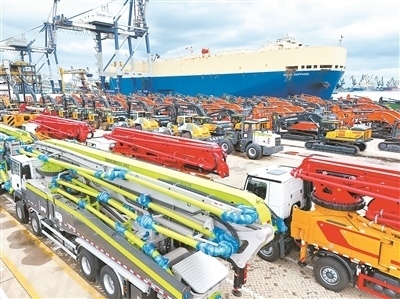 10月14日,國產(chǎn)工程機(jī)械在山東港口煙臺港集結(jié)等待裝船出口。唐 克攝(人民視覺)