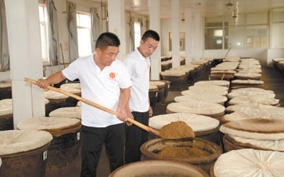 一旁,28歲的學(xué)徒李君正把缸里的醋醅翻到另一個(gè)醋缸之中。這是為了降溫而進(jìn)行的“打平翻缸”操作,要持續(xù)15天時(shí)間?!八螏煾嫡f,發(fā)酵環(huán)節(jié)最難掌握的就是溫度的控制和時(shí)機(jī)?!币郧胺N地為生的李君,已經(jīng)跟著宋俊鵬學(xué)了5年釀醋,一個(gè)月有將近4000元的收入,“學(xué)會(huì)獨(dú)門技藝,咱也是手藝人了!”
