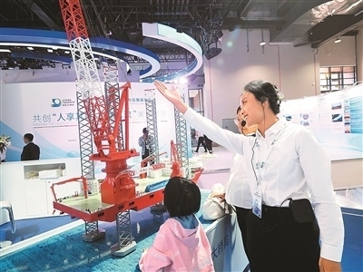 第十六屆國際交通技術(shù)與設(shè)備展覽會上,觀眾在參觀“大橋海風(fēng)”號風(fēng)電安裝船。杜建坡攝(人民圖片)