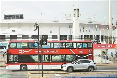 在智利首都圣地亞哥,一輛新能源公交車行駛在街頭。這條路線的十輛雙層新能源公交車由中國制造。近年來,中國制造的新能源汽車不斷進(jìn)入智利市場,憑借綠色環(huán)保的特點和先進(jìn)科技的應(yīng)用廣受當(dāng)?shù)孛癖姷那嗖A。新華社記者 辛悅衛(wèi)攝