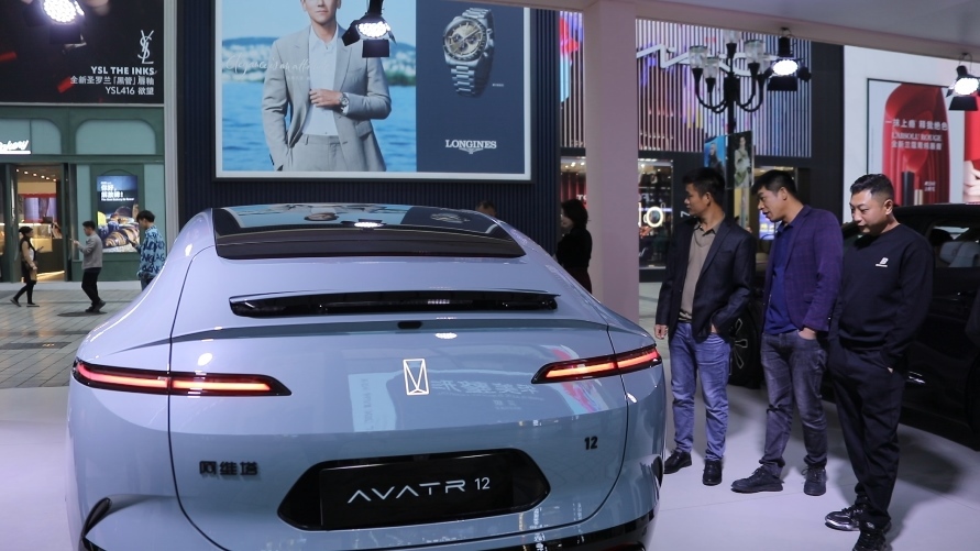 新上市的新能源汽車長(zhǎng)安阿維塔12雙動(dòng)力車型吸引往來(lái)游客。新華社記者趙小帥 攝
