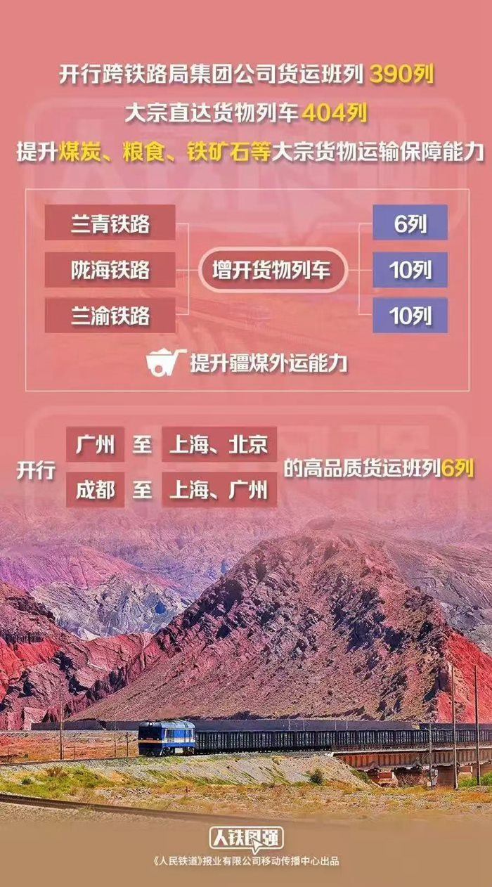 貨運(yùn)方面,鐵路部門統(tǒng)籌運(yùn)用線路、場(chǎng)站資源,安排開(kāi)行跨鐵路局集團(tuán)公司貨運(yùn)班列390列,大宗直達(dá)貨物列車404列,提升煤炭、糧食、鐵礦石等大宗貨物運(yùn)輸保障能力,為冬季能源保供和國(guó)民經(jīng)濟(jì)平穩(wěn)運(yùn)行提供有力支撐。其中,優(yōu)化調(diào)整蘭州鐵路樞紐列車運(yùn)行方案,蘭青、隴海、蘭渝鐵路分別增開(kāi)貨物列車6列、10列、10列,提升疆煤外運(yùn)能力。適應(yīng)貨運(yùn)市場(chǎng)需求,優(yōu)化貨運(yùn)班列產(chǎn)品供給,開(kāi)行廣州至上海、北京,成都至上海、廣州的高品質(zhì)貨運(yùn)班列6列,串聯(lián)京津冀、長(zhǎng)三角、粵港澳大灣區(qū)、成渝地區(qū)等主要經(jīng)濟(jì)區(qū)域,打造快捷物流產(chǎn)品示范線。