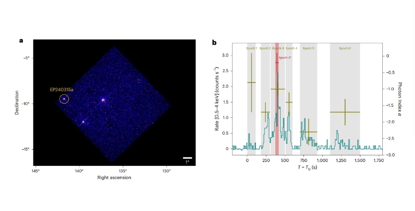 此后,世界各地多個天文望遠鏡陸續(xù)觀測到EP240315a。研究結(jié)果表明,EP240315a產(chǎn)生于遙遠的早期宇宙,當時宇宙年齡僅為現(xiàn)在的10%,EP240315a的信號花費了125億年才抵達地球。