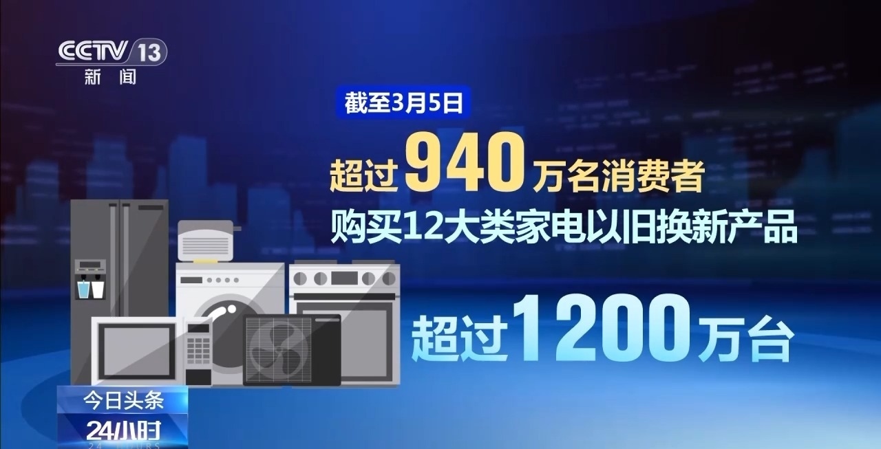 商務(wù)部數(shù)據(jù)顯示,截至3月5日,超過940萬名消費(fèi)者購買12大類家電以舊換新產(chǎn)品超過1200萬臺(tái),已有超過3400萬名消費(fèi)者申請(qǐng)了超過4200萬件手機(jī)等數(shù)碼產(chǎn)品購新補(bǔ)貼。