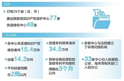 保護(hù)知識(shí)產(chǎn)權(quán)就是保護(hù)創(chuàng)新。中共中央、國(guó)務(wù)院印發(fā)的《知識(shí)產(chǎn)權(quán)強(qiáng)國(guó)建設(shè)綱要(2021—2035年)》提出,“建立完善知識(shí)產(chǎn)權(quán)仲裁、調(diào)解、公證、鑒定和維權(quán)援助體系”。目前,已有29個(gè)省(區(qū)、市)建設(shè)國(guó)家級(jí)知識(shí)產(chǎn)權(quán)保護(hù)中心77家、快速維權(quán)中心48家。