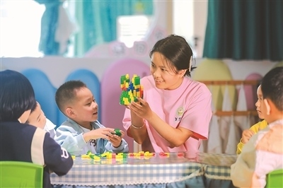 貴州省黔西市近年來鼓勵和引導社會力量興辦普惠托育機構,有效構建起覆蓋城鄉(xiāng)的普惠托育服務體系。圖為5月12日,黔西市蓮城街道一托育中心,老師帶領小朋友堆積木。