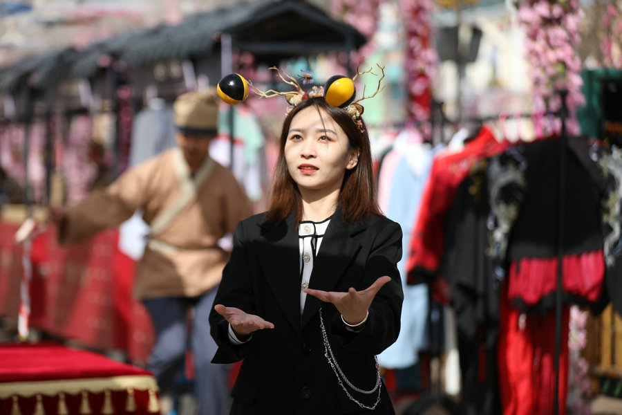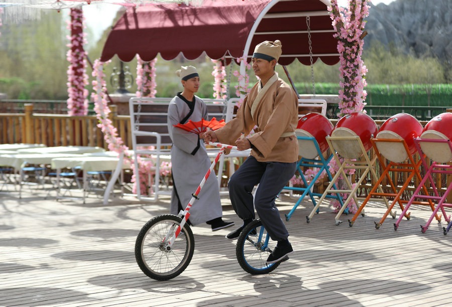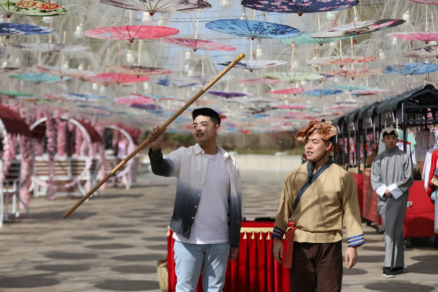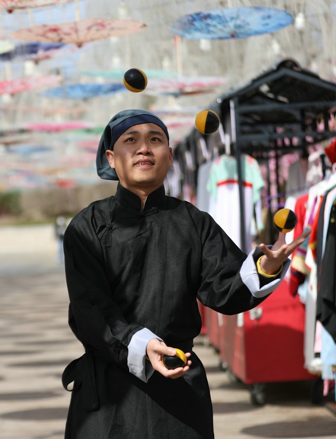 園區(qū)昔日的觀景臺(tái),今日變身“迎春路”,花團(tuán)錦簇的搖椅,五顏六色的油紙傘,身著古典裝扮的演員,精彩絕倫的雜技表演,吸引著游客艷羨的目光,引來(lái)陣陣歡呼。蹴鞠、投壺等民俗互動(dòng)游戲讓游客參與其中,各色美食,令人大快朵頤,“迎春路”上春光燦爛,儼然一片歡樂的海洋。