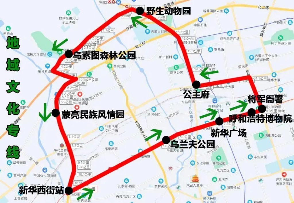 地域文化專線(新華西街站——蒙亮民族風(fēng)情園),途經(jīng):新華西街、新華大街、哲里木路、海拉爾大街、通道北路、生態(tài)路、鹽站西街、北二環(huán)輔道、西二環(huán)輔道。沿途設(shè)站:新華西街,烏蘭夫公園、新華廣場、呼和浩特博物院、將軍衙署、公主府、野生動(dòng)物園、烏素圖森林公園、蒙亮民族風(fēng)情,全程:29公里,配車:10臺(tái)。