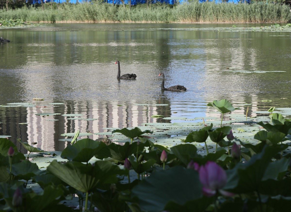 7月8日,兩只黑天鵝在青城公園荷花叢旁游過