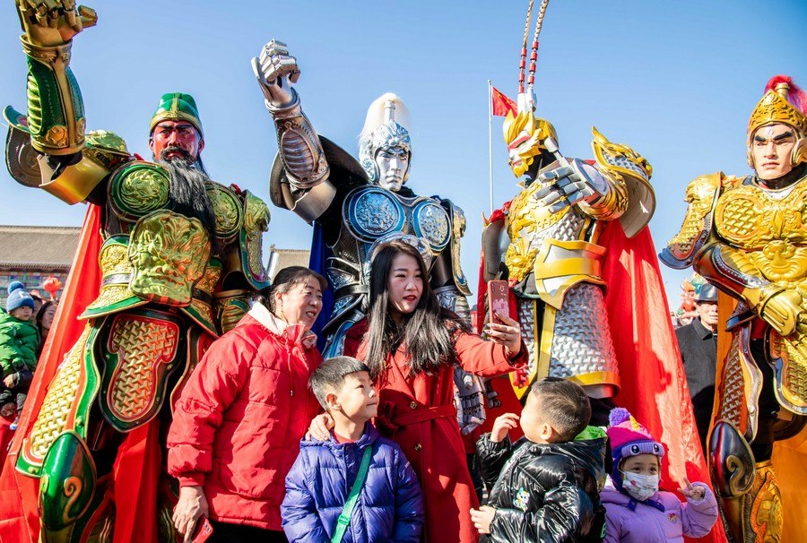 2024年2月15日,人們?cè)诤艉秃铺厥杏袢獏^(qū)塞上老街旅游休閑街區(qū)與國(guó)風(fēng)機(jī)甲拍照留影。丁根厚 攝
