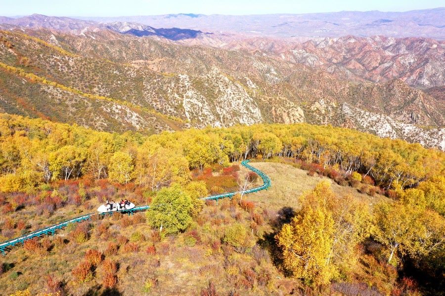 9月26日,游客乘坐小火車游玩固陽馬鞍山