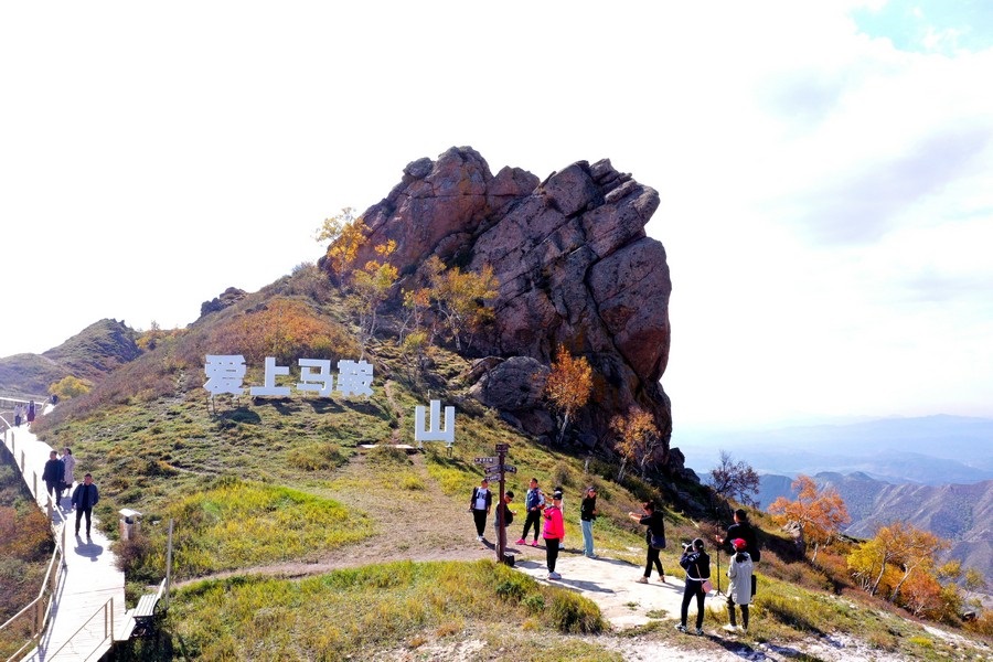 9月26日,游客在一片金黃的固陽馬鞍山游玩