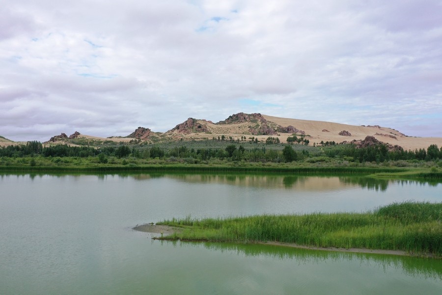 玉龍沙湖位于內(nèi)蒙古赤峰市翁牛特旗,這里集沙漠、怪石、古樹(shù)、奇峰、草原、湖泊、濕地等于一身,5萬(wàn)畝草原與茫茫的科爾沁沙地相連,綠洲掩映,湖光山色,形成沙海相連的奇特景觀。