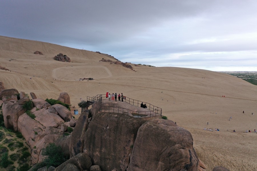 7月31日,雨后的玉龍沙湖空氣清新,游客在玉龍沙湖景區(qū)越野穿沙、騎駱駝?dòng)瓮?,欣賞沙海奇觀。