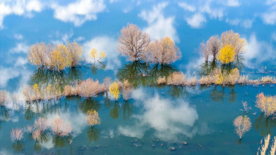 秋冬交替之際,位于呼和浩特土默特左旗的哈素海,水天一色,樹(shù)影倒映,構(gòu)成一幅美麗的水彩畫(huà)卷,猶如人間仙境。 樂(lè)炎 攝影