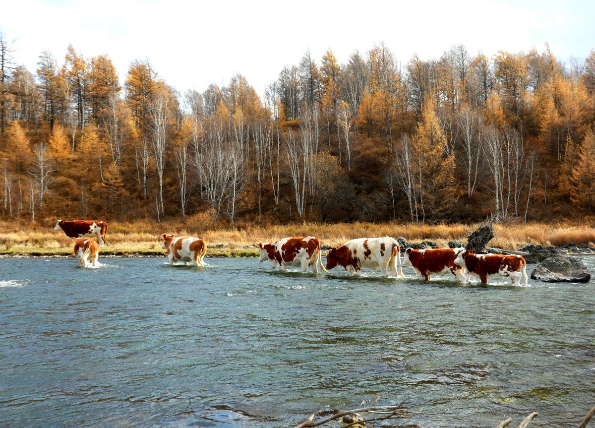 9月29日,內(nèi)蒙古阿爾山國(guó)家森林公園一群牛蹚過(guò)不凍河 北疆新聞?dòng)浾?張楊攝影