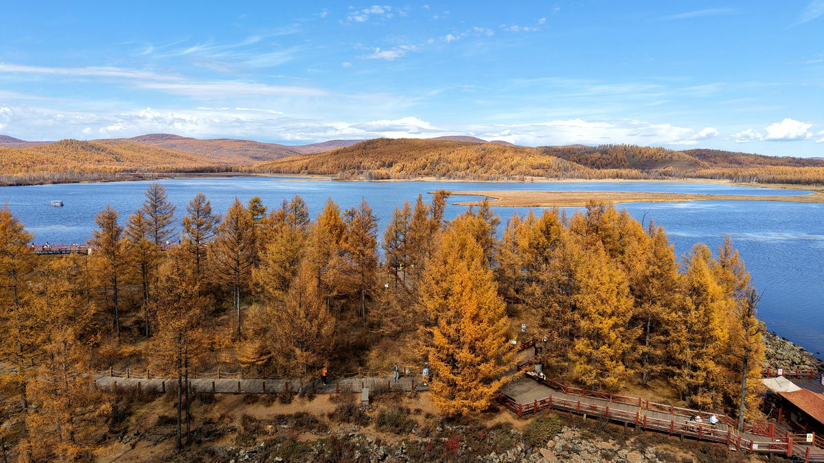 9月29日,空中視角下的內(nèi)蒙古阿爾山國(guó)家森林公園杜鵑湖 北疆新聞?dòng)浾?張楊攝影