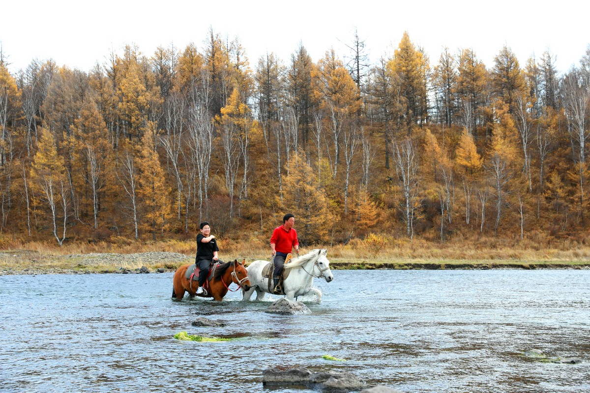 9月29日,游客在內(nèi)蒙古阿爾山國(guó)家森林公園不凍河邊體驗(yàn)騎馬 北疆新聞?dòng)浾?張楊攝影