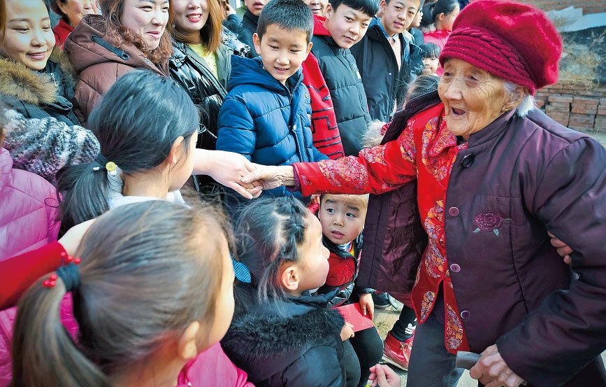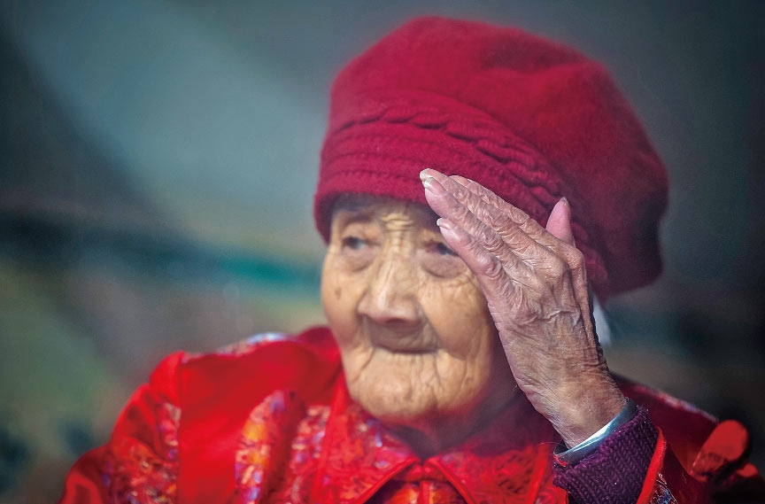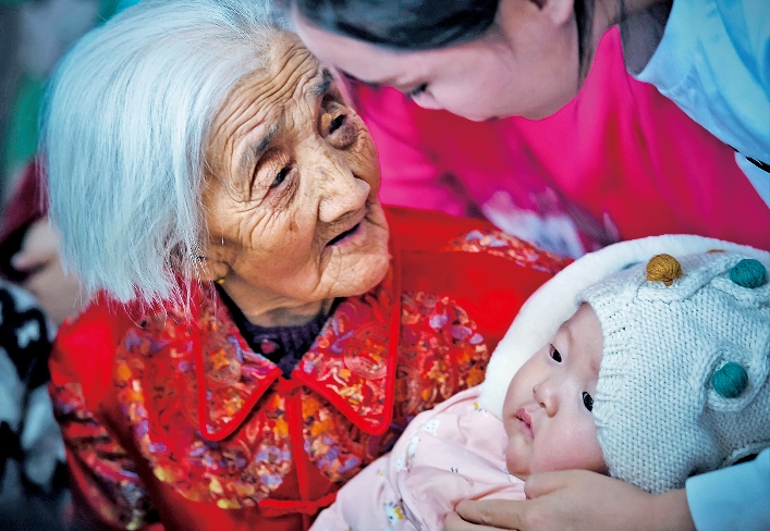 老人的兒孫們?nèi)缃翊蠖喽荚谕鈱W(xué)習(xí)、工作、做生意,大家族的成員日子都過(guò)得紅紅火火。對(duì)于老人來(lái)說(shuō),子孫滿堂是最幸福的事;對(duì)于孩子們來(lái)說(shuō),老人健康長(zhǎng)壽,也是他們最大的愿望。五世同堂,98口人,百歲老人賈先女露出幸福的笑容。