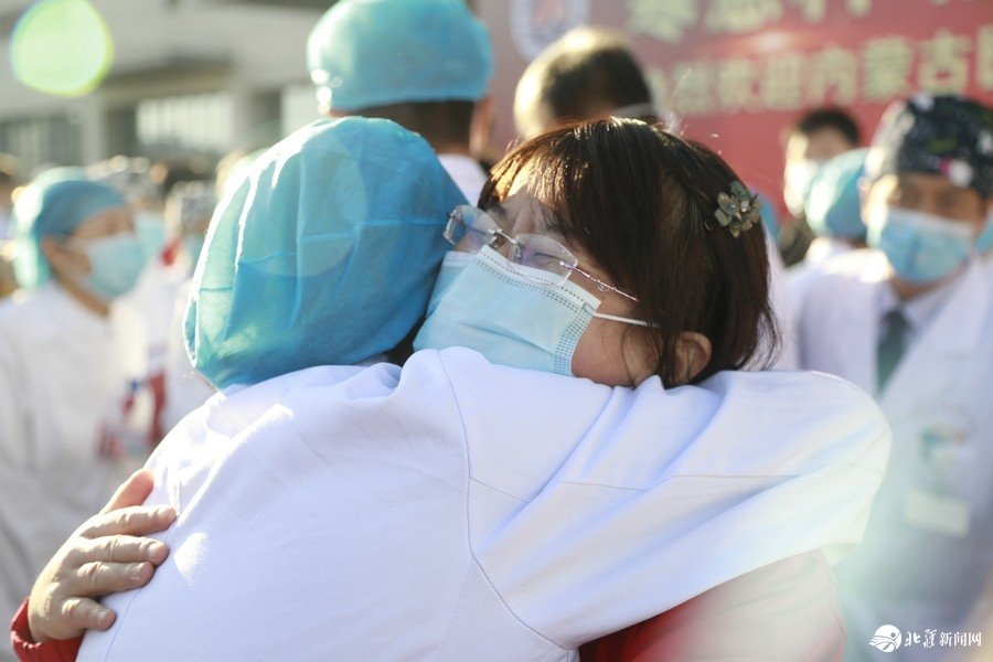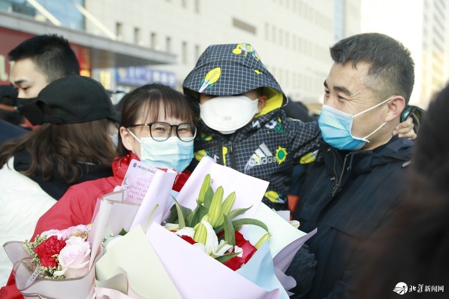 “終于把你們盼回來啦!”家人、同事們熱情擁抱,喜極而泣,歡迎“白衣戰(zhàn)士”平安歸來。