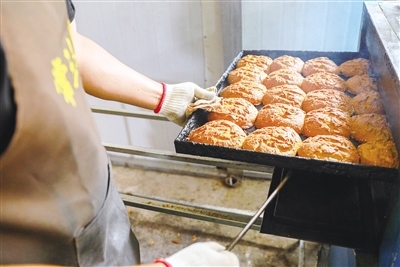 “我們堅(jiān)持手工制作,就是想留住這個(gè)味道!”常三文是隆盛莊月餅制作技藝非遺傳承人,他帶記者來(lái)到了打月餅的作坊。一個(gè)約60平方米的房間里有兩個(gè)大鐵鍋,一個(gè)鐵鍋里熬著糖水,另一個(gè)鐵鍋用來(lái)和面。一名男工將面粉、熟胡麻油、糖水等按比例倒入鐵鍋,然后用鐵鏟攪拌起來(lái)。鐵鍋旁邊是一個(gè)做月餅的大案板,4個(gè)女工稱重、分劑、做胚、擺放,各自忙活著。常三文的兒子常曉峰負(fù)責(zé)將擺放好的月餅放進(jìn)燒爐火的烤爐,計(jì)時(shí)、下簽子、刷油……直至月餅烤制完成出爐。