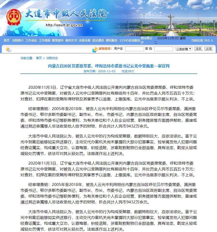 2020年11月3日,遼寧省大連市中級人民法院公開宣判內(nèi)蒙古自治區(qū)黨委原常委、呼和浩特市委原書記云光中受賄案,對被告人云光中以受賄罪判處有期徒刑十四年,并處罰金人民幣五百五十萬元;對查封、扣押在案的受賄所得財(cái)物及其孳息予以追繳,上繳國庫。云光中當(dāng)庭表示服從判決,不上訴。