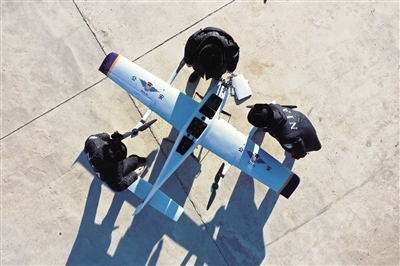 測(cè)量、加油、調(diào)試、升空……隨著螺旋槳高速轉(zhuǎn)動(dòng),一架 “鷹眼”固定翼無(wú)人機(jī)騰空而起,劃破北疆寂靜的天空,以每小時(shí)110公里的速度沿著邊管區(qū)巡航。