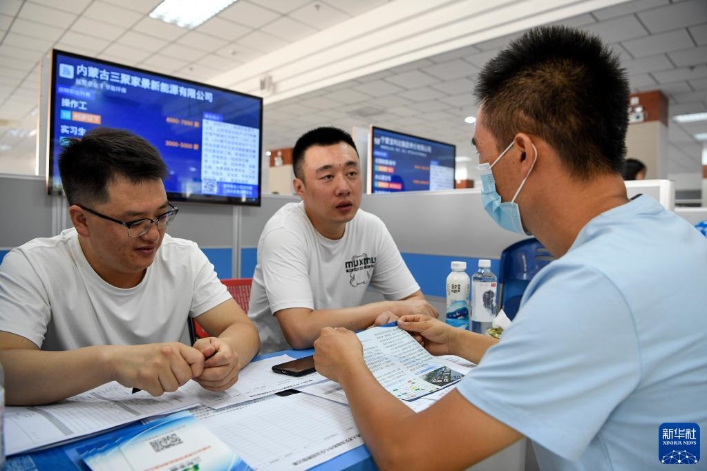 求職者(右一)在2021年寧夏銀川夏季人才招聘大會(huì)暨高校畢業(yè)就業(yè)雙選招聘會(huì)上與用人單位交流(7月24日攝)。新華社記者馮開華攝