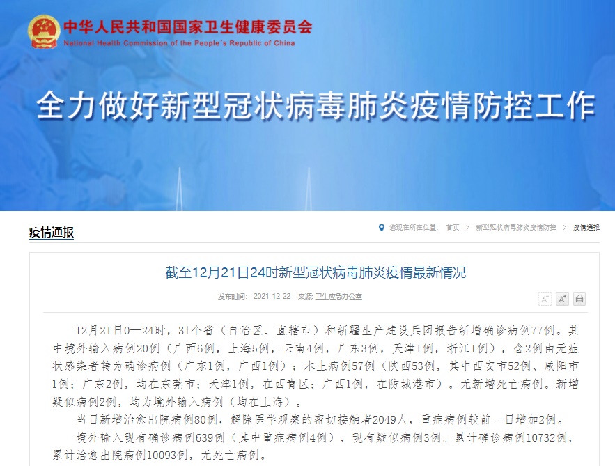 12月21日0—24時(shí),31個(gè)省(自治區(qū)、直轄市)和新疆生產(chǎn)建設(shè)兵團(tuán)報(bào)告新增確診病例77例。其中境外輸入病例20例(廣西6例,上海5例,云南4例,廣東3例,天津1例,浙江1例),含2例由無癥狀感染者轉(zhuǎn)為確診病例(廣東1例,廣西1例);本土病例57例(陜西53例,其中西安市52例、咸陽市1例;廣東2例,均在東莞市;天津1例,在西青區(qū);廣西1例,在防城港市)。無新增死亡病例。新增疑似病例2例,均為境外輸入病例(均在上海)。