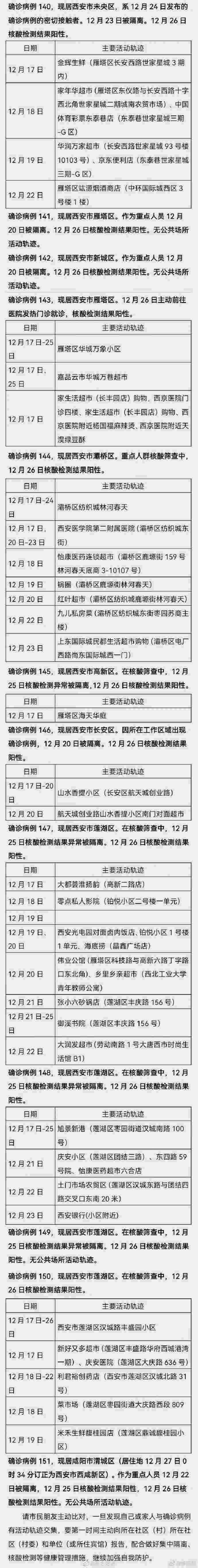 根據(jù)疾控等部門流調(diào)情況,12月26日0-24時(shí)西安市新增的150例確診病例的公共場(chǎng)所活動(dòng)軌跡公布如下: