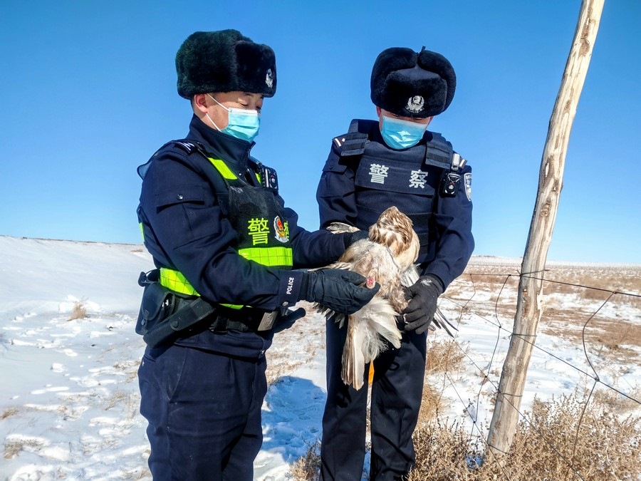 北疆新聞網(wǎng)、北疆新聞APP、北疆云消息(記者 劉嬙 通訊員 張路 張冬)2月10日,內(nèi)蒙古烏蘭察布市四子王旗腦木更邊境派出所民警在執(zhí)勤巡邏途中,發(fā)現(xiàn)一只“大鳥”被困在網(wǎng)圍欄上。民警靠近后仔細(xì)觀察發(fā)現(xiàn),這只“大鳥”在奮力撲打翅膀但無法飛行,右爪缺失,受傷嚴(yán)重。民警通過手機(jī)搜索網(wǎng)絡(luò)圖片比對,初步判定為國家二級保護(hù)動物鷹隼。