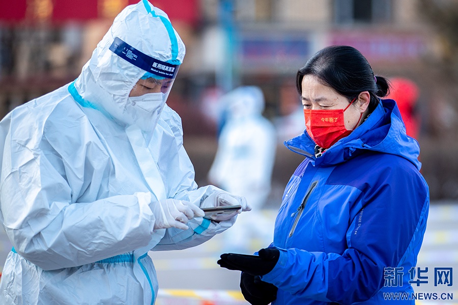 2月21日,在呼和浩特市玉泉區(qū)興隆巷街道芳清園小區(qū)臨時(shí)核酸采樣點(diǎn),點(diǎn)位長(zhǎng)在核酸采樣現(xiàn)場(chǎng)工作。新華網(wǎng)發(fā) (丁根厚 攝)