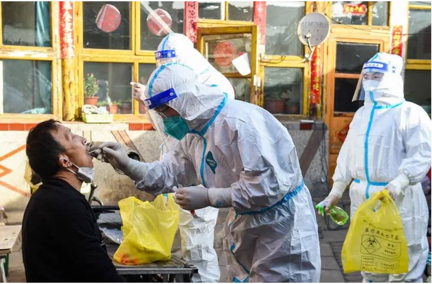 ↑3月6日,在呼和浩特市賽罕區(qū)東瓦窯社區(qū),網格員(右一)輔助醫(yī)務工作者為次密接群眾上門做核酸檢測。