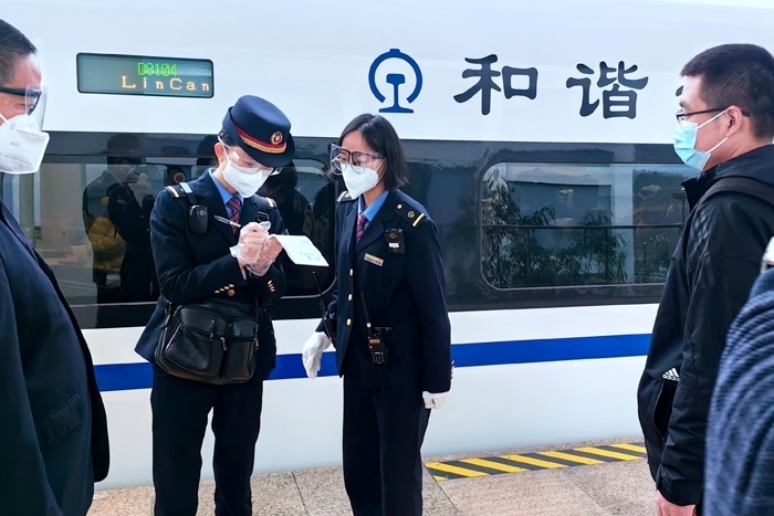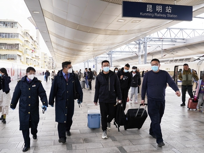 云縣站工作人員引導醫(yī)務(wù)人員進入站臺乘坐動車。中國鐵路昆明局集團有限公司供圖